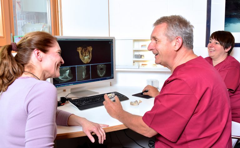 Die Behandlung dauert in der Regel mehrere Monate, da das Implantat erst im Knochen einwachsen muss (Osseointegration), bevor der endgültige Zahnersatz befestigt werden kann.