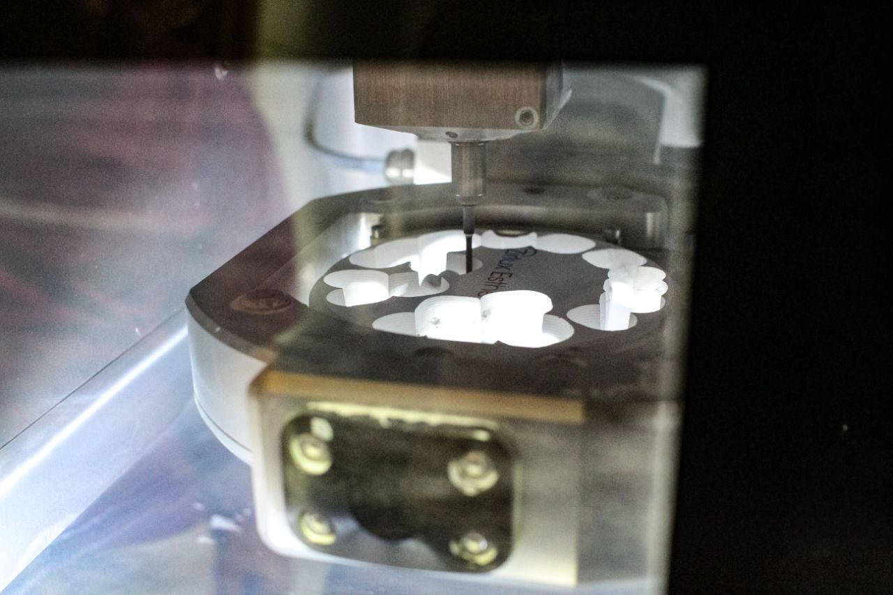Die digitalen Daten des Zahnersatzes werden direkt in unserer Praxis mit CAM (Computer Aided Manufacturing) weiterverarbeitet. Dabei werden VHF-Fräsen und ein Asiga-Drucker verwendet. Anschließend erfolgt die zahntechnische Ausarbeitung, insbesondere die farbliche Anpassung an die natürliche Zahnsubstanz durch das praxiseigene Labor.
